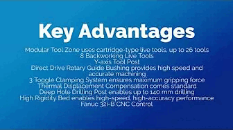 Swiss turning performance with job shop flexibility. The B0326-III is a 6-axis convertible opposed gang tool CNC lathe that adds Y2-Axis capability to the back tool post of the B0 configuration. Overlapped, simultaneous machining is enabled. Plus, back slotting, back end milling, and back cross drilling/tapping may be performed. Use the B0326-III for traditional 32 mm Swiss turning or for making shorter parts with the included chucker kit.