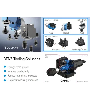BENZ Tooling manufactures German-engineered tooling systems to include Live Driven and Static Tools, Angle Heads, Multi-Spindle Heads, and Broaching units for CNC Turning and Machining Center applications. BENZ Tooling provides standard tooling, and they are specialists when it comes to custom tooling tailored according to customer requirements offering various solutions for optimal machining for heavy duty machining in limited spaces for automotive components and processing highly complex components used with aggregates for jet engine applications. BENZ Tooling is sold and serviced throughout North America with Repair Service, Parts, Accessories, Preventative Maintenance, Rapid Repair Kits, Expedited Service, Conversions and Upgrades available. BENZ Tooling serves the production of precision machined products and turned parts for all general industries, including manufacturing, aerospace, automotive, and energy sectors. Right Angle Heads for Machining Centers, Live Tooling for Lathes, and Metal Cutting Tools are specialties for Benz Tooling a Business unit of SCHENCK USA CORP.
