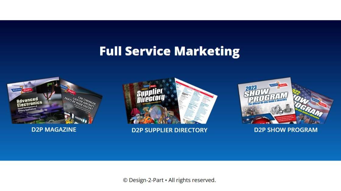 For over 50 years, Design-2-Part has connected the finest American job shops and contract manufacturers with OEM engineers, management, and buyers who need their expertise and services. With products for face-to-face, print, digital and online, we create efficiencies for both buyer and vendor in the sourcing of product design, custom parts, components, prototypes and assemblies.